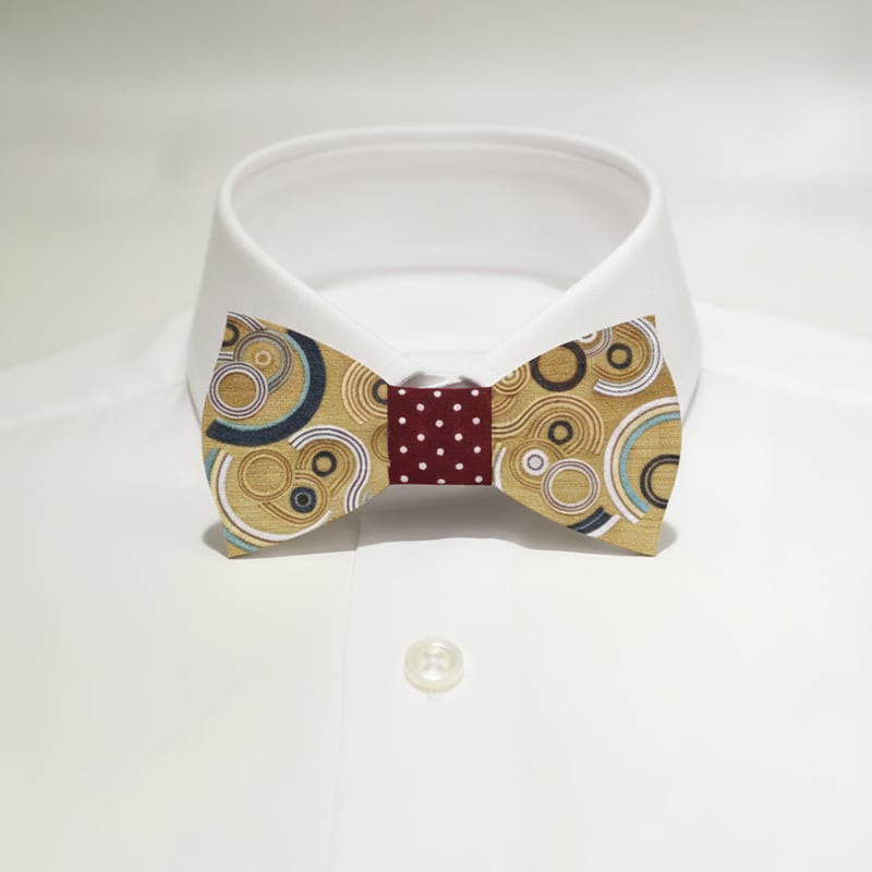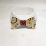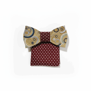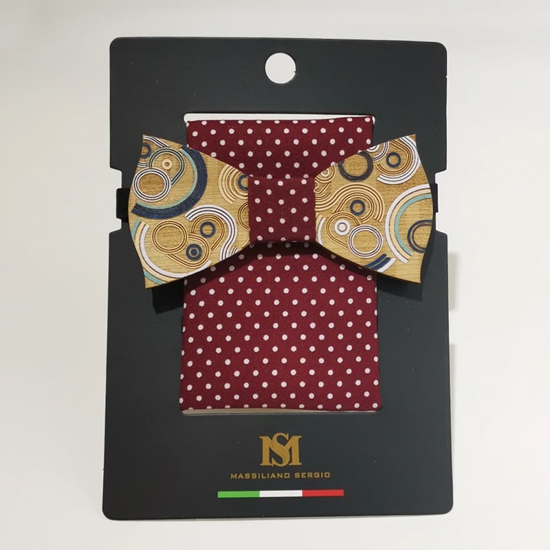 Подчертайте елегантността си с уникалната папийонка, създадена за мъже с вкус към нестандартното. Изработена от естествено дърво с детайлни геометрични елементи и бордо текстилен център на точки, този аксесоар съчетава традиция и модерен стил.