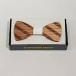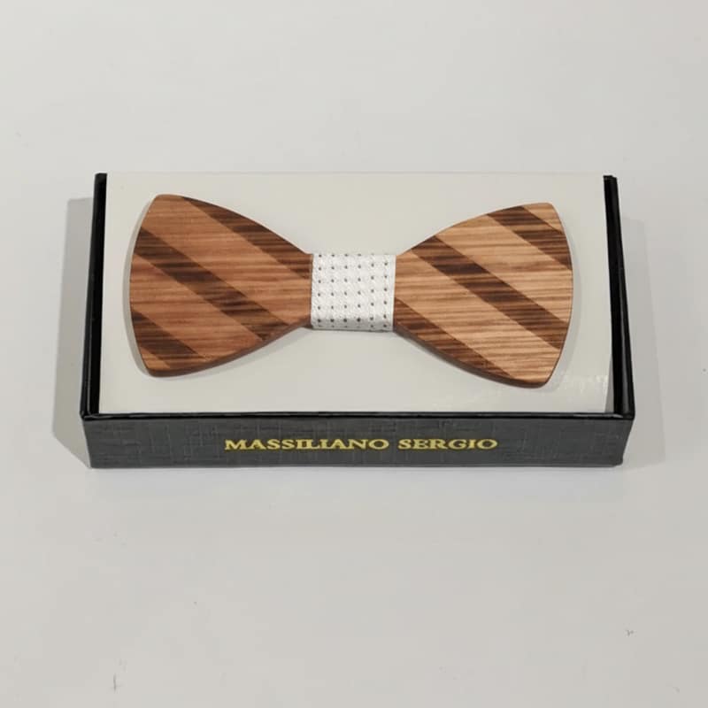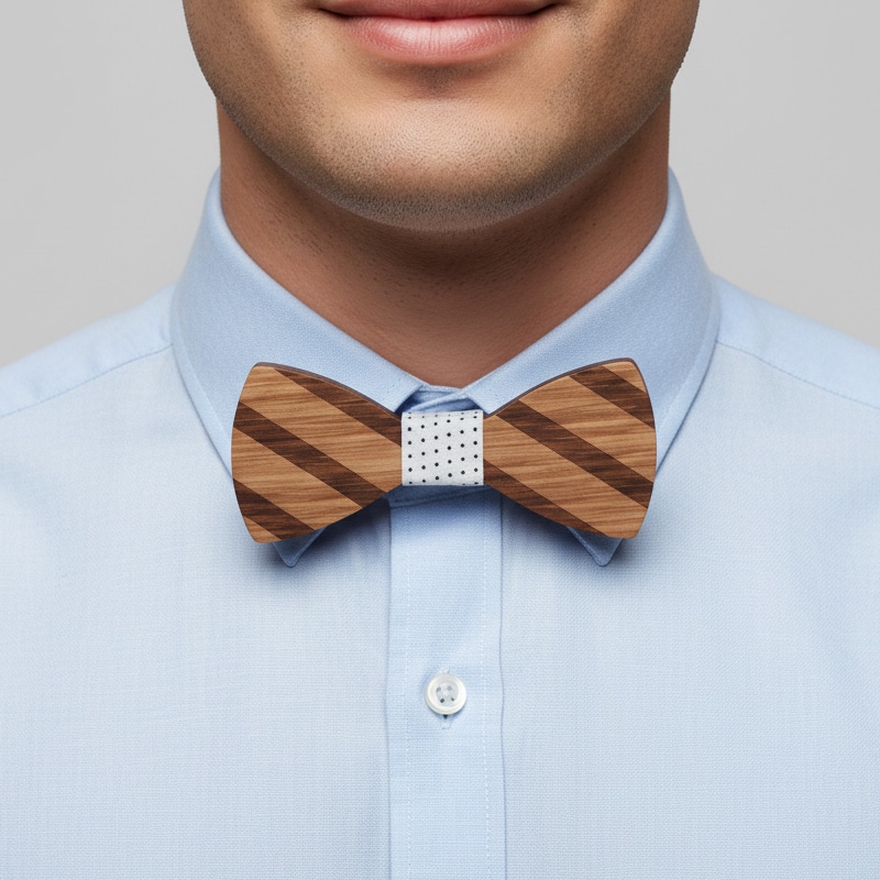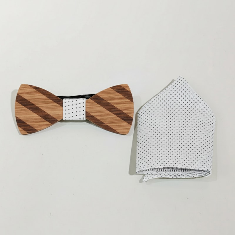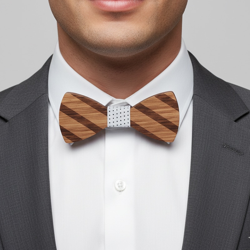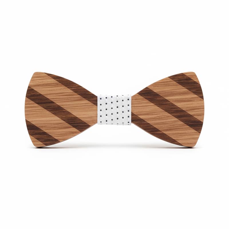 Открои се с елегантност и характер – дървената папионка майсторски изработена от естествено дърво с изразителен диагонален райе мотив и завършена с контрастен бял текстилен център на ситни черни точки. Идеалният избор за мъже с вкус към нетрадиционната класика и дизайнерски акценти.