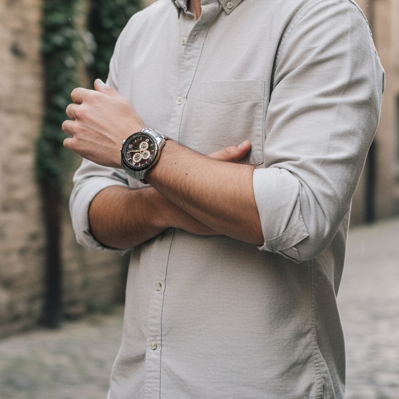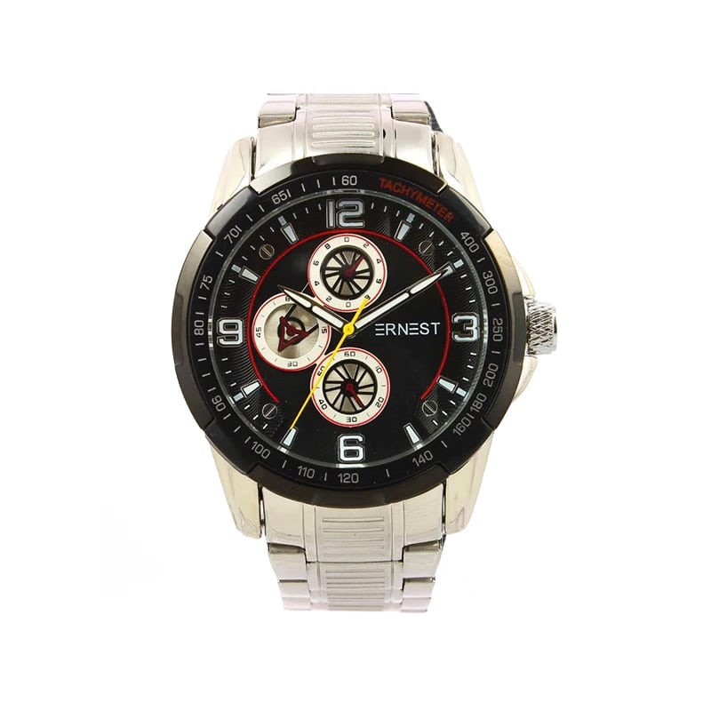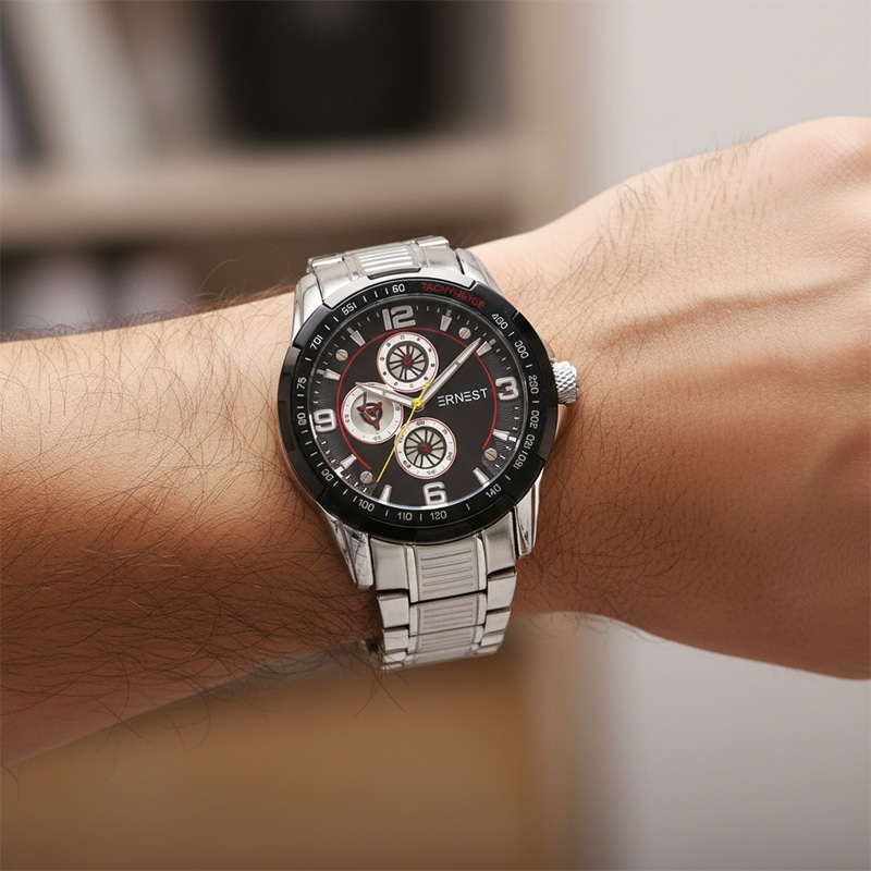 Това е елегантен и мъжествен часовник, съчетаващ спортна естетика с класическа визия. Сребристата верижка от неръждаема стомана се допълва от стилен черен циферблат с декоративен хронограф дизайн и червени акценти. Диаметърът на корпуса е 46 мм – идеален за силно излъчване на увереност.