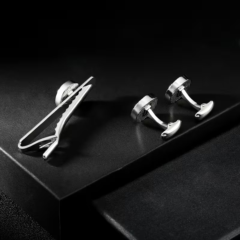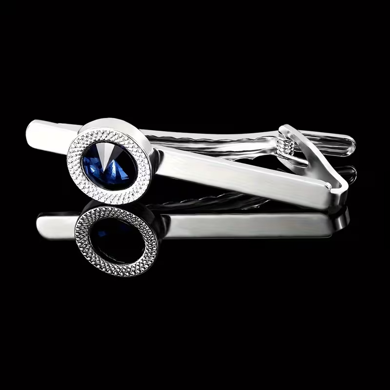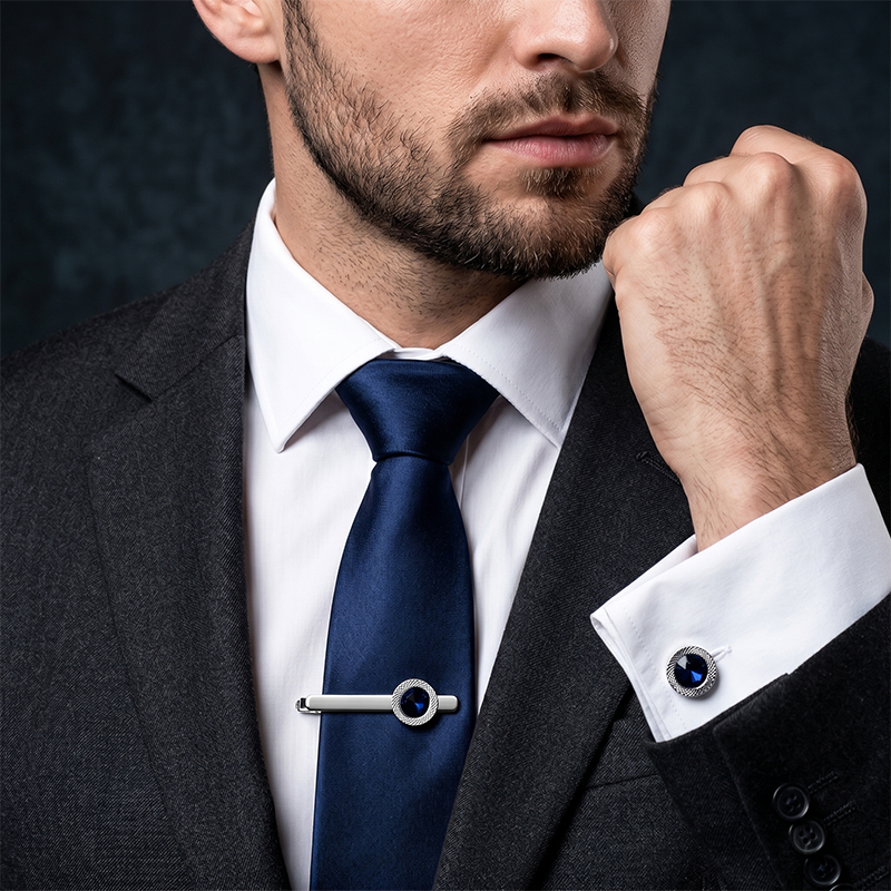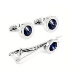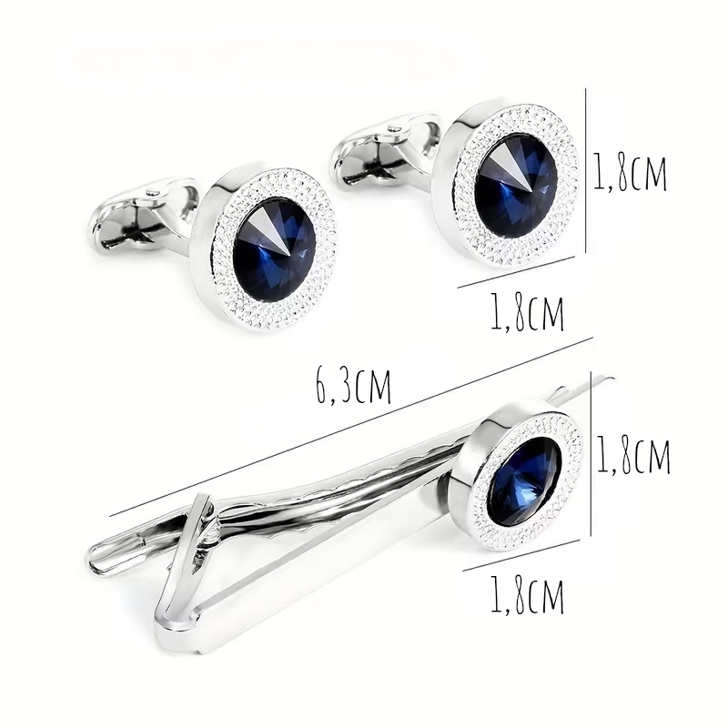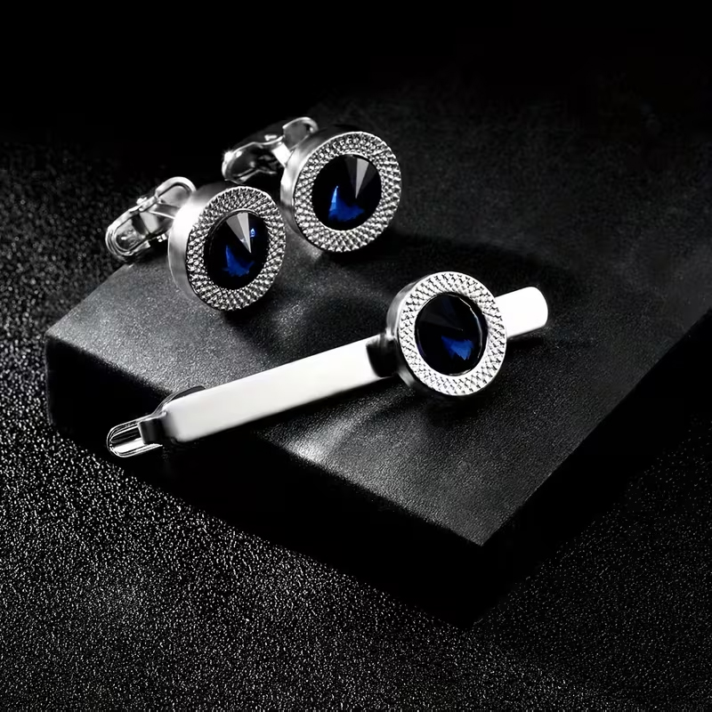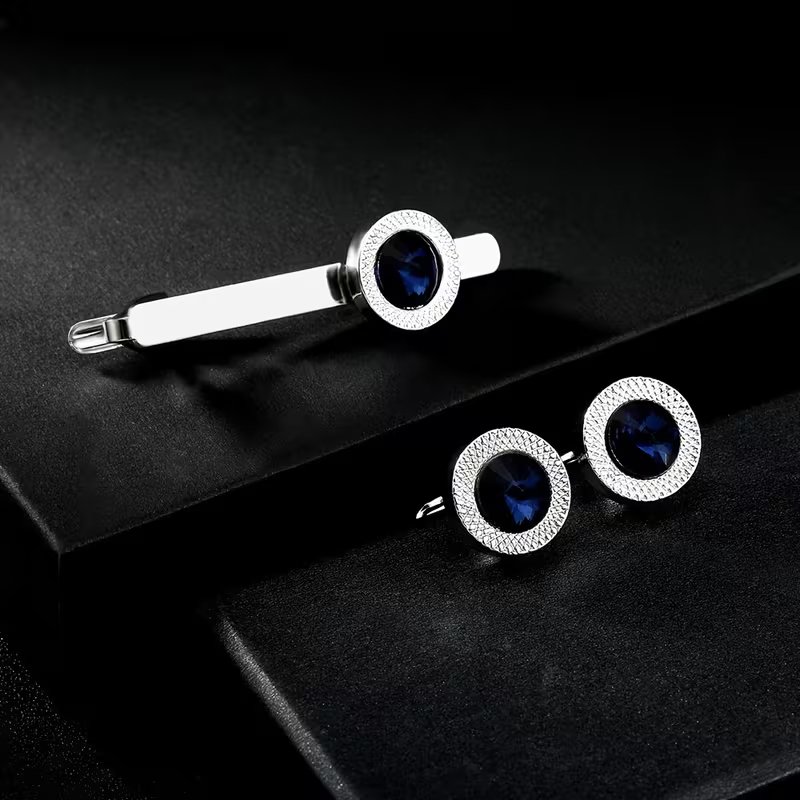 Елегантен комплект мъжки аксесоари – копчета за ръкавели и щипка за вратовръзка, съчетаващи класически дизайн и дълбок син акцент. Фасетираният камък придава изискан блясък и усещане за стил. Изработени с внимание към детайла, аксесоарите допълват перфектно официалната визия и придават завършеност на всеки костюм.