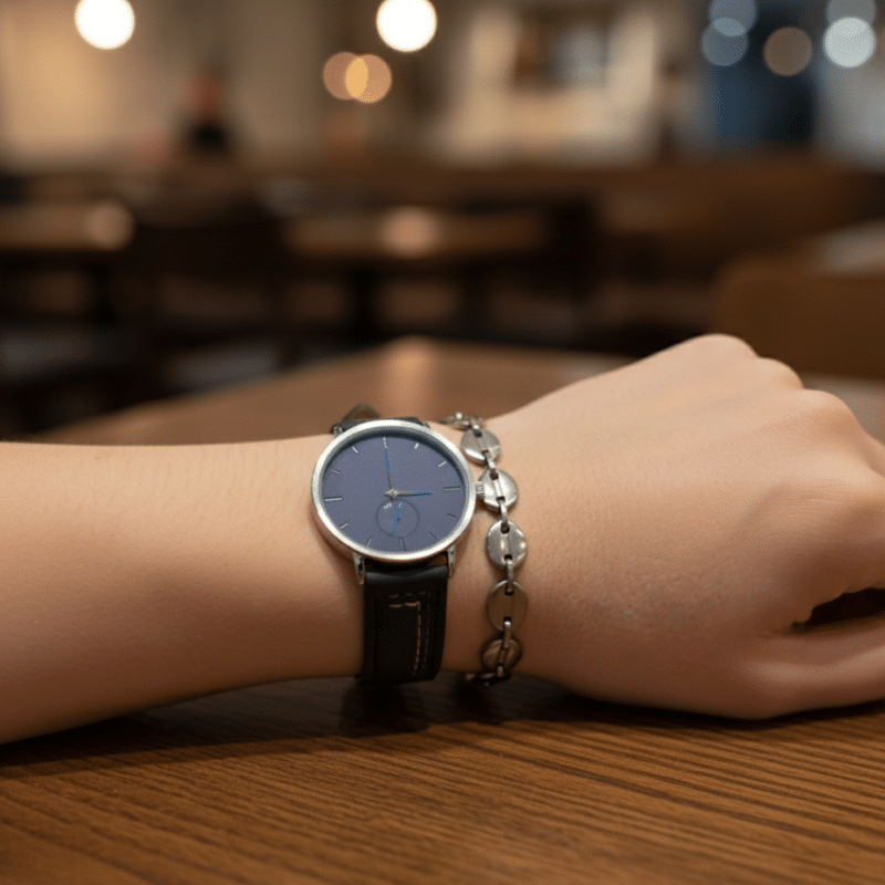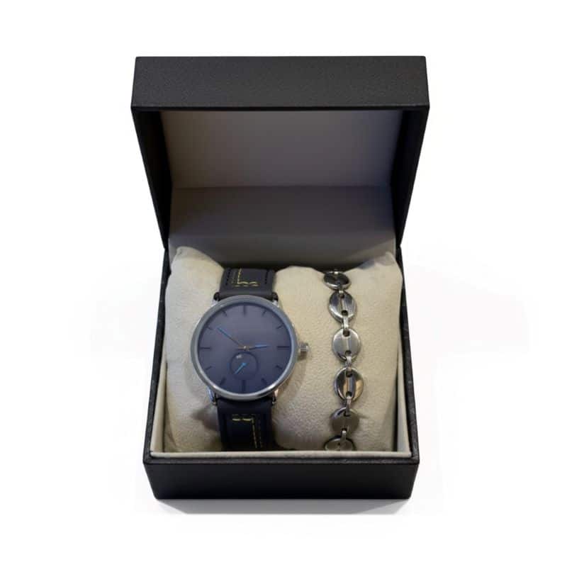 Часовникът впечатлява с тъмно син циферблат и контрастни сини стрелки, придаващи модерен акцент. В комплекта е включена и метална гривна със сребристо покритие, изработена от масивни елементи с елегантно излъскана повърхност — перфектен аксесоар за завършена визия.