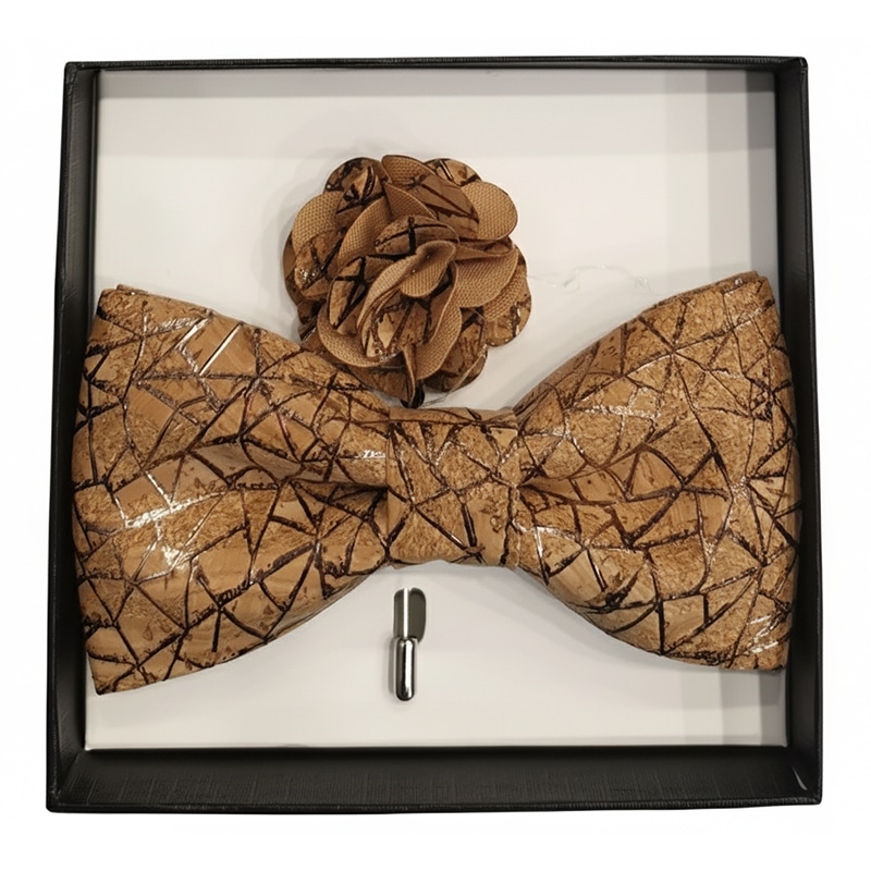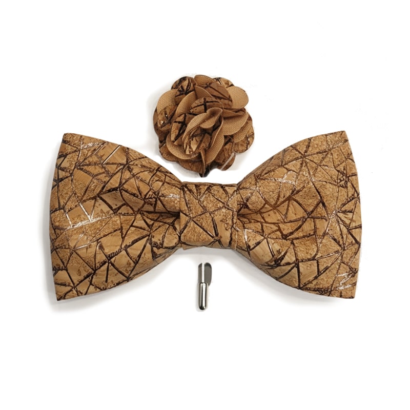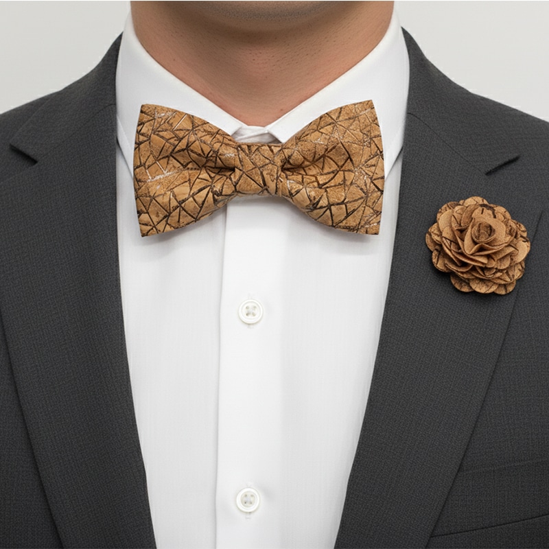 Папийонка от естествен корк с флорална декорация, съчетаващ модерен дизайн и устойчиви материали. Впечатляващ избор за мъже с вкус към нестандартното, елегантно и природосъобразно облекло.