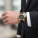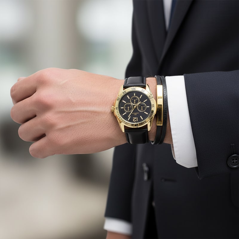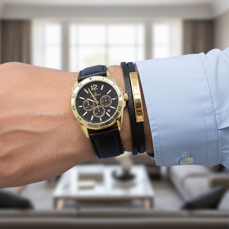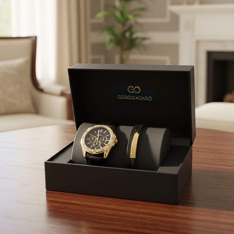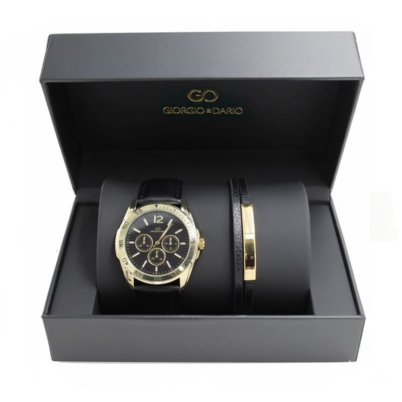 Това е изискан подаръчен комплект за модерния мъж с вкус към класиката. Включва стилен часовник с черен циферблат и златист корпус, съчетан с кожена каишка и метална гривна със златни акценти. Всичко е поднесено в елегантна кутия – перфектен избор за подарък.