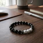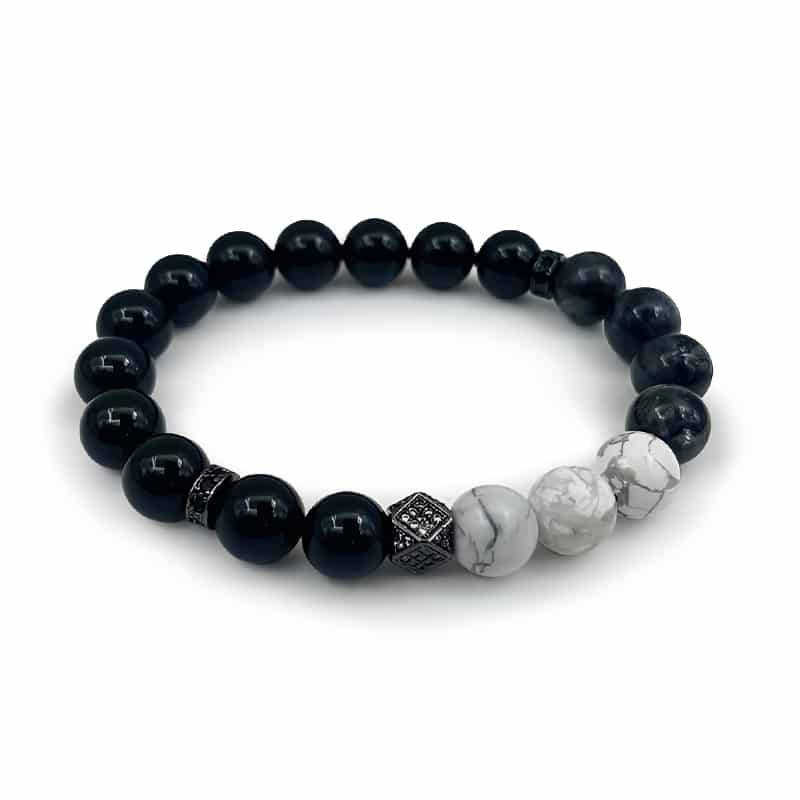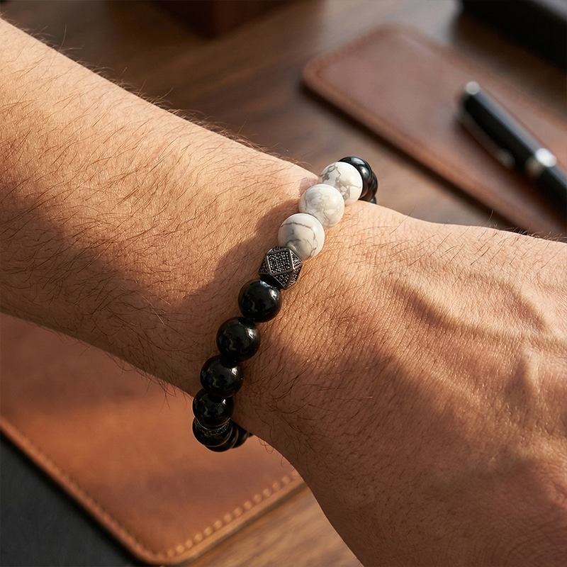 Гривна, създадена за мъже с усет към детайла и търсещи символика в стила си. Съчетава лъскави черни камъни с мраморно бели естествени камъни – израз на хармонията между противоположностите: ден и нощ, разум и емоция, сила и спокойствие.