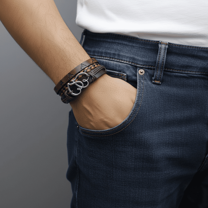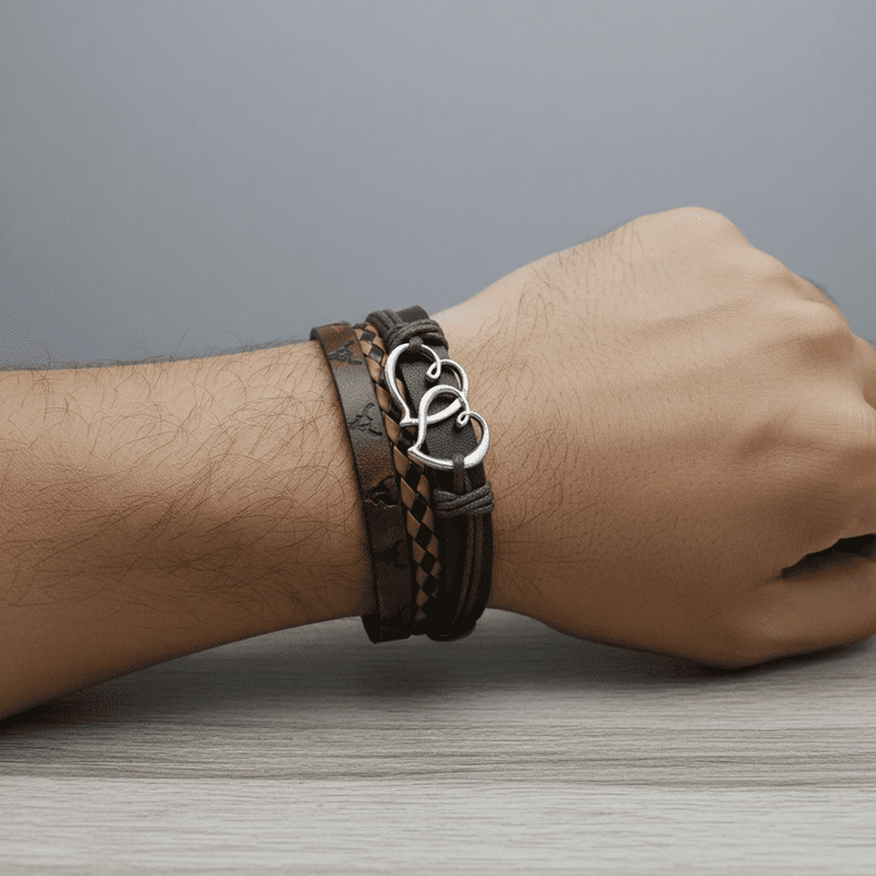 Стилна гривна в кафяво и черно от синтетична кожа. Регулируемият дизайн осигурява удобно носене, а комбинацията от символика и стил я прави подходяща за всекидневна употреба и подарък за специален човек.