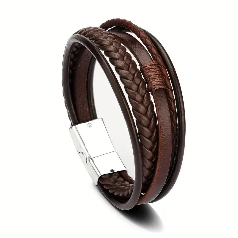 Тази елегантна кожена гривна в топли кафяви тонове комбинира традиционен плетен дизайн със здрава метална закопчалка. Идеален аксесоар за мъже, които ценят класиката, свободата и силата в детайлите.