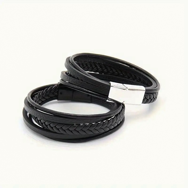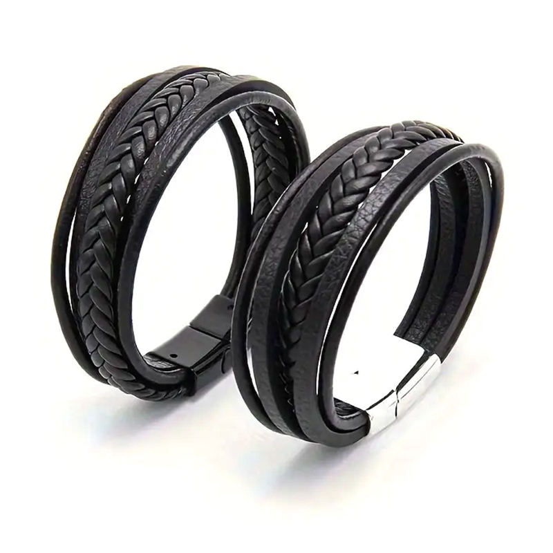 Тази мъжка гривна комбинира изискан стил и устойчивост – изработена от черна плетена синтетична кожа с метална закопчалка в сребристо. Дизайнът с няколко ленти придава мъжествен и модерен вид, подходящ както за ежедневието, така и за специални поводи. Перфектен аксесоар за всеки, който цени класиката с характер.