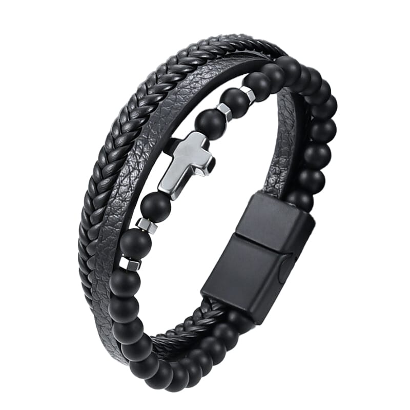 Стилна мъжка гривна, съчетаваща естествени матови мъниста и висококачествена плетена синтетична кожа. Централният акцент е метален кръст – символ на вяра и стабилност, който придава характер и дълбочина на дизайна. Универсален и модерен аксесоар, подходящ за ежедневието или специални поводи. С удобна магнитна закопчалка за сигурност и комфорт при носене.