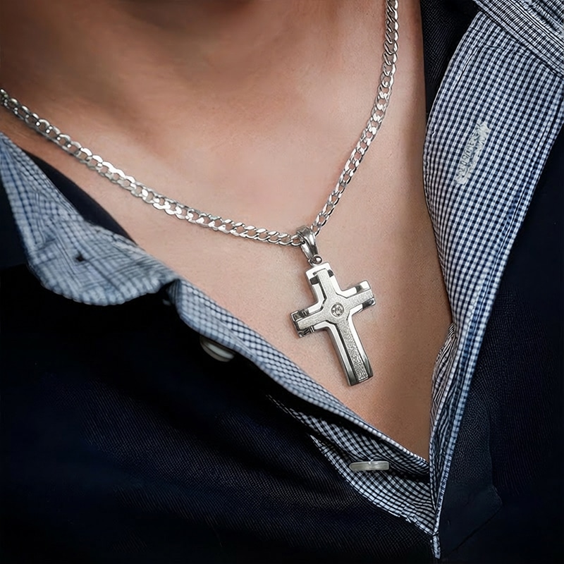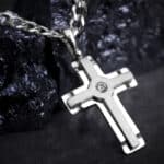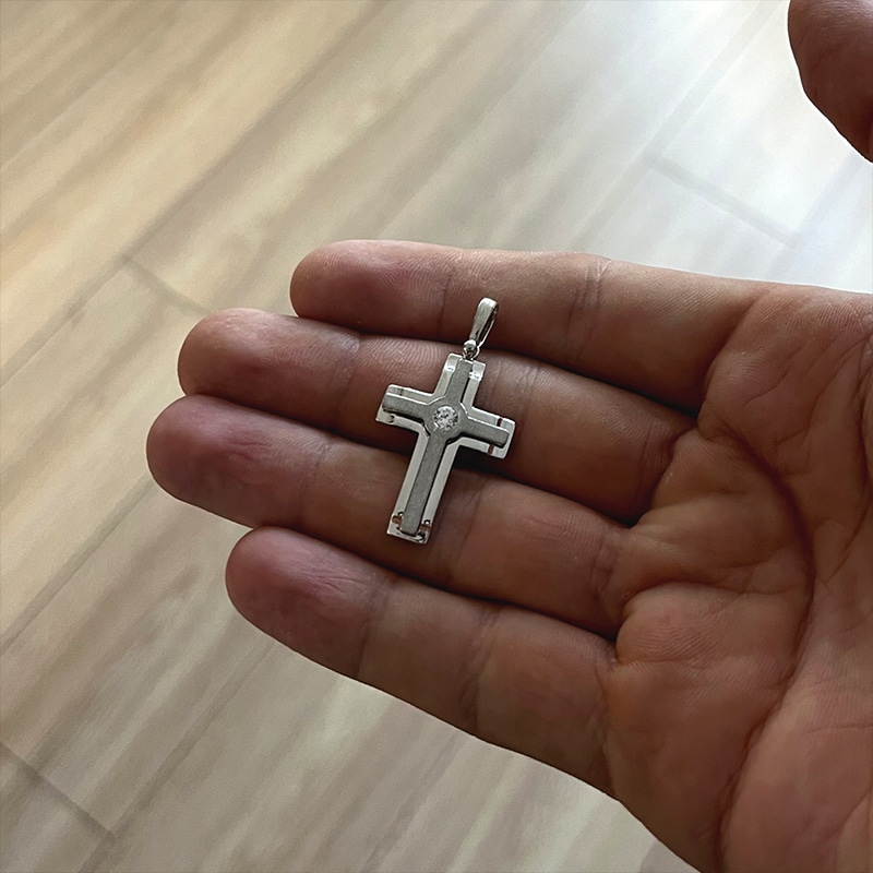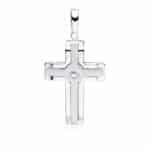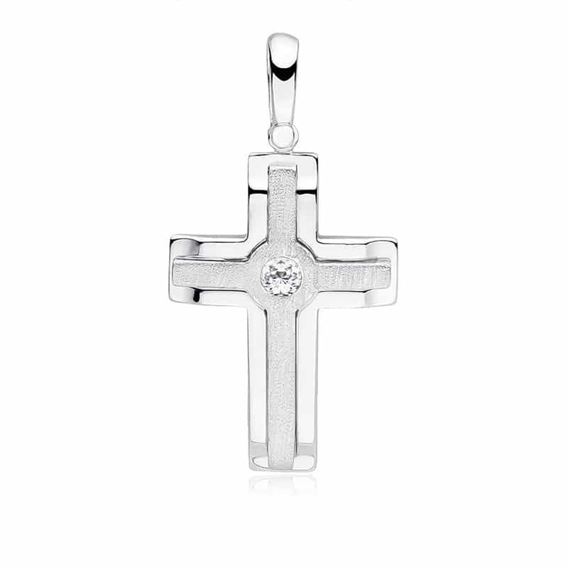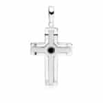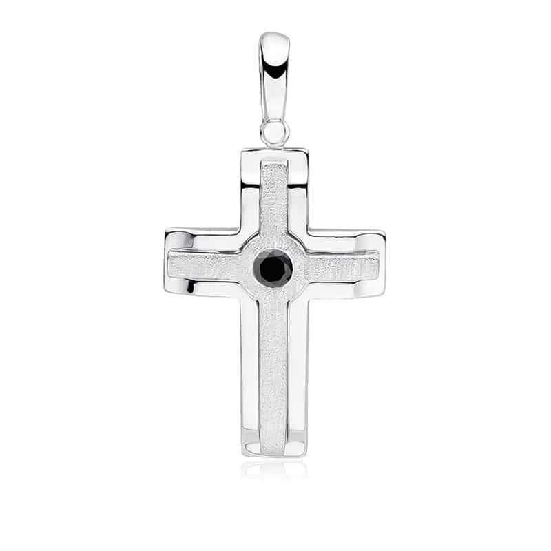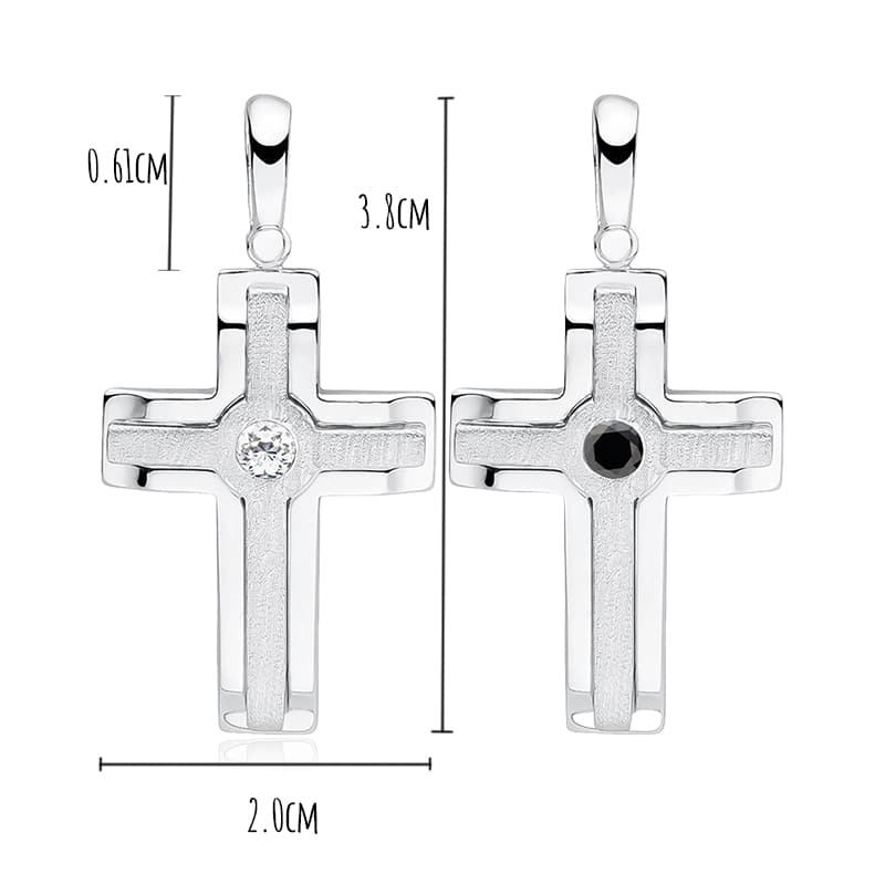Сребърен кръст със цирконий в средата. Предлага се с бял или черен камък.