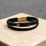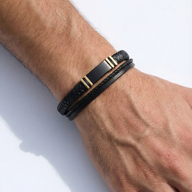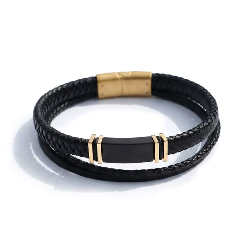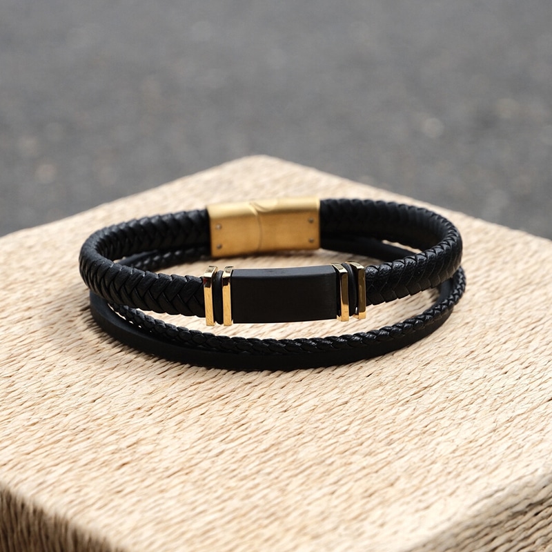 Излъчвайте сила и елегантност с гривна съчетание от черна плетена кожа и златисти стоманени елементи. Модерен дизайн, който говори вместо вас – без излишни думи.