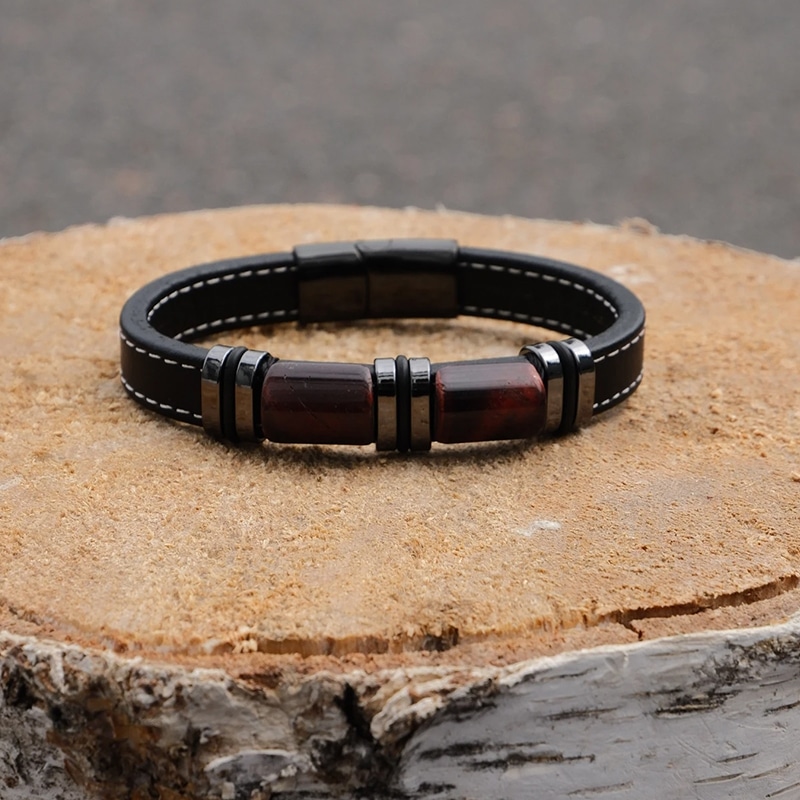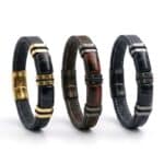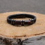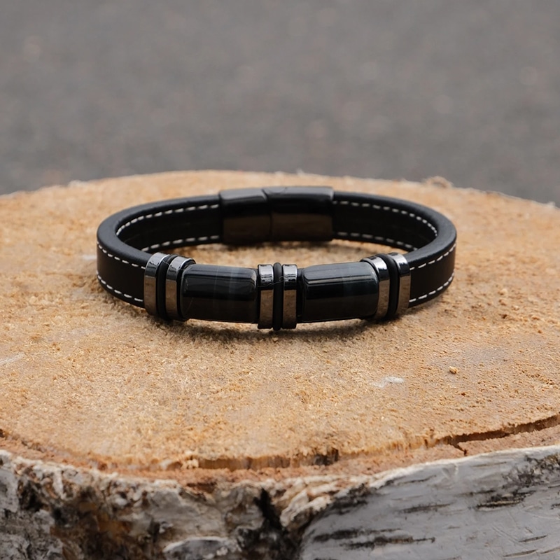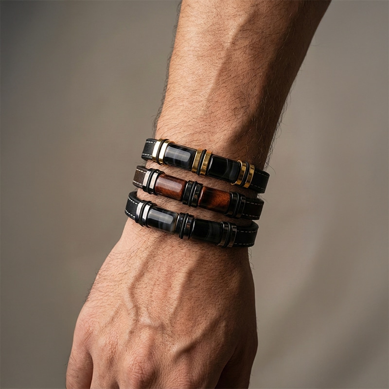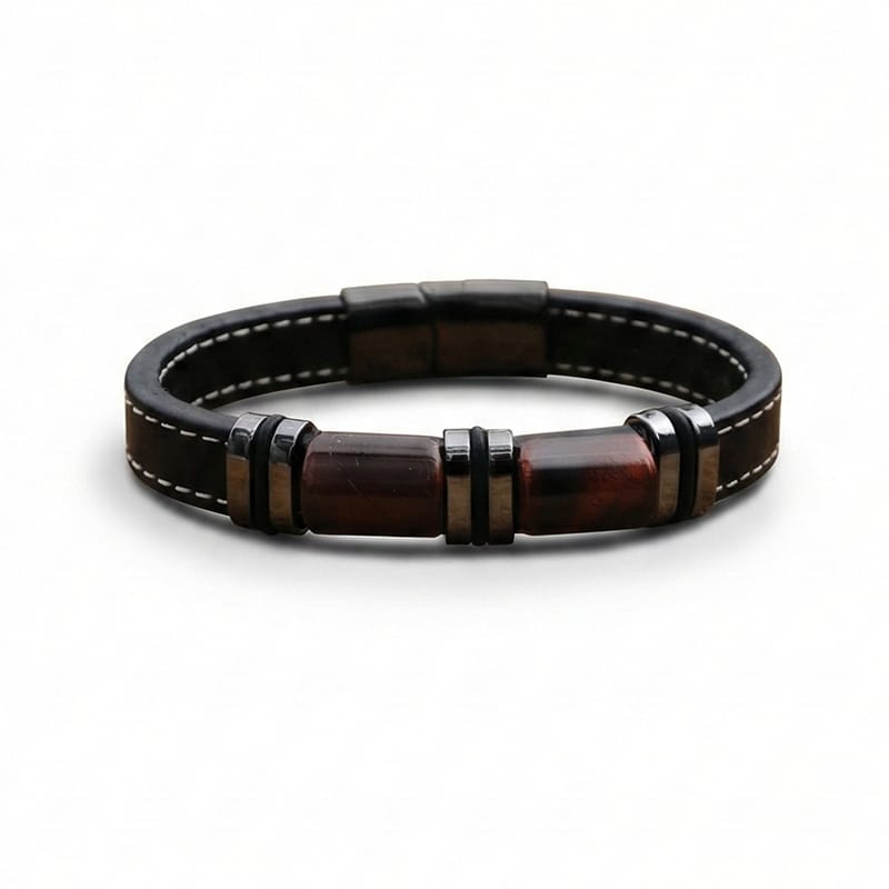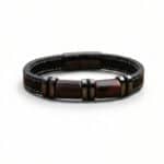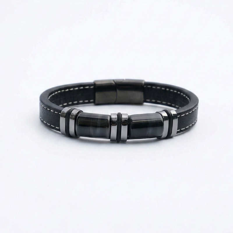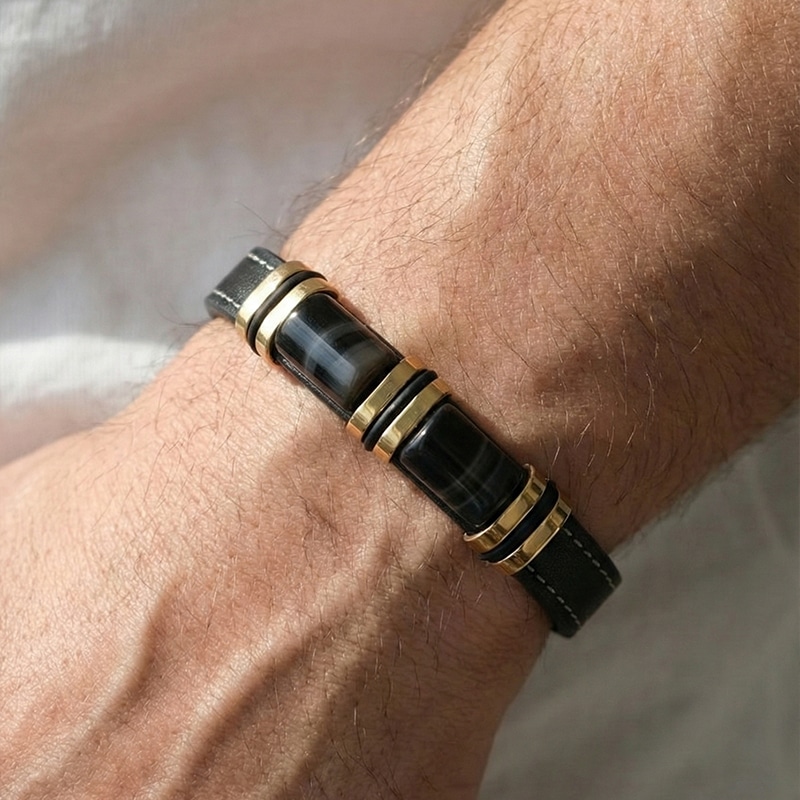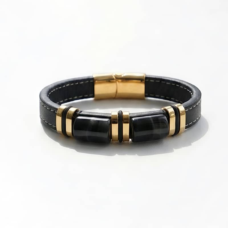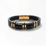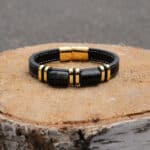 Гривна за мъже с вкус към елегантността и мощния стил. Изработена от устойчиви материали – еко кожа и неръждаема стомана, тази гривна излъчва увереност и характер. Златистите метални акценти придават допълнителен лукс, подходящ както за ежедневието, така и за специални поводи.