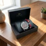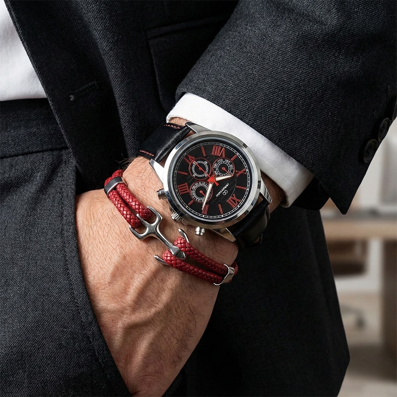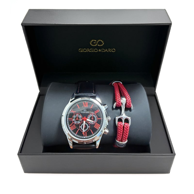 Луксозен подаръчен комплект за мъже от Giorgio & Dario, включващ стилен аналогов часовник с черен циферблат и червени акценти, допълнен от елегантна каишка от синтетична кожа. В допълнение – модерна плетена гривна в червено с метална котва, придаваща морски дух и характер. Идеален избор за специален повод или стилен аксесоар в ежедневието. Поднесен в луксозна черна кутия – готов за подаряване.