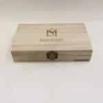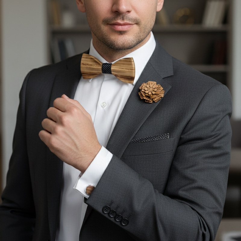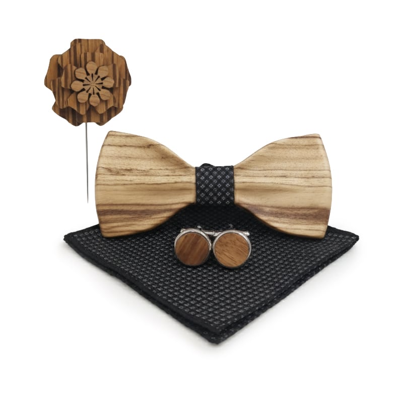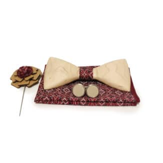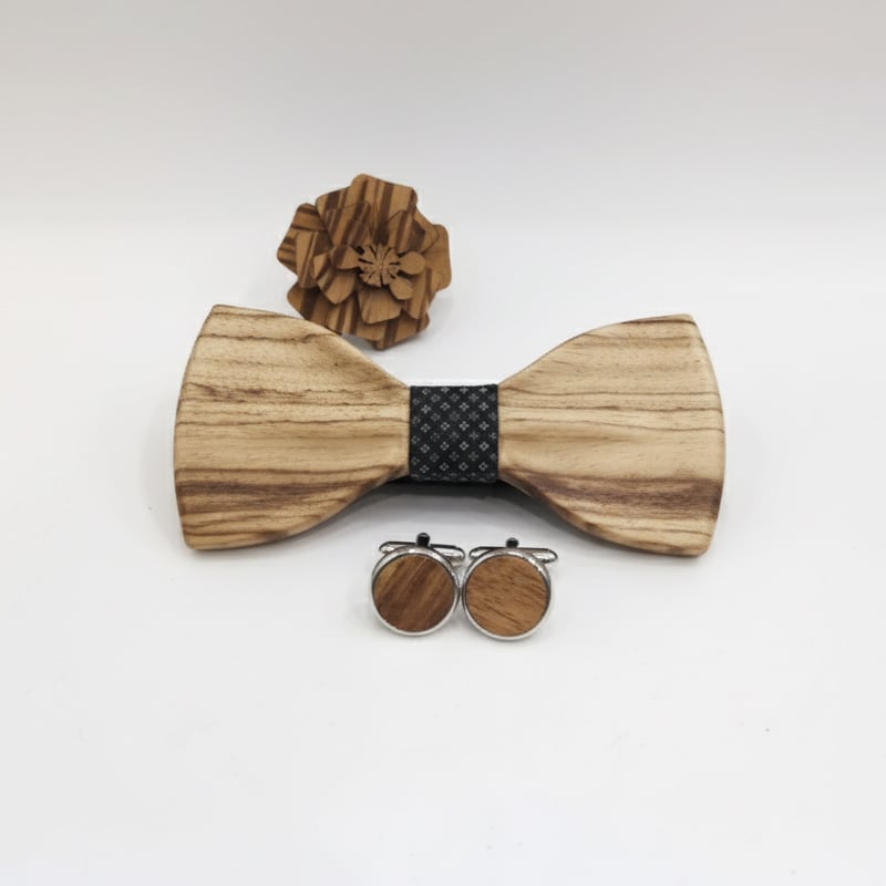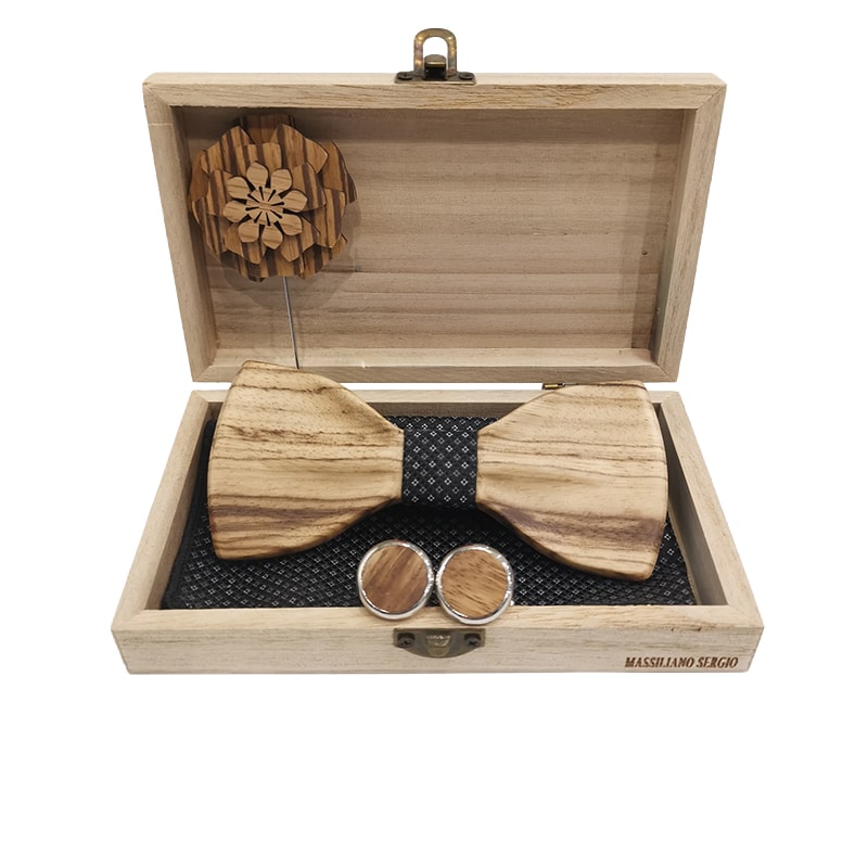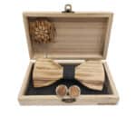 Луксозен комплект, който включва ръчно изработена дървена папийонка, стилни ръкавели и флорална брошка, подредени в елегантна подаръчна дървена кутия.