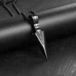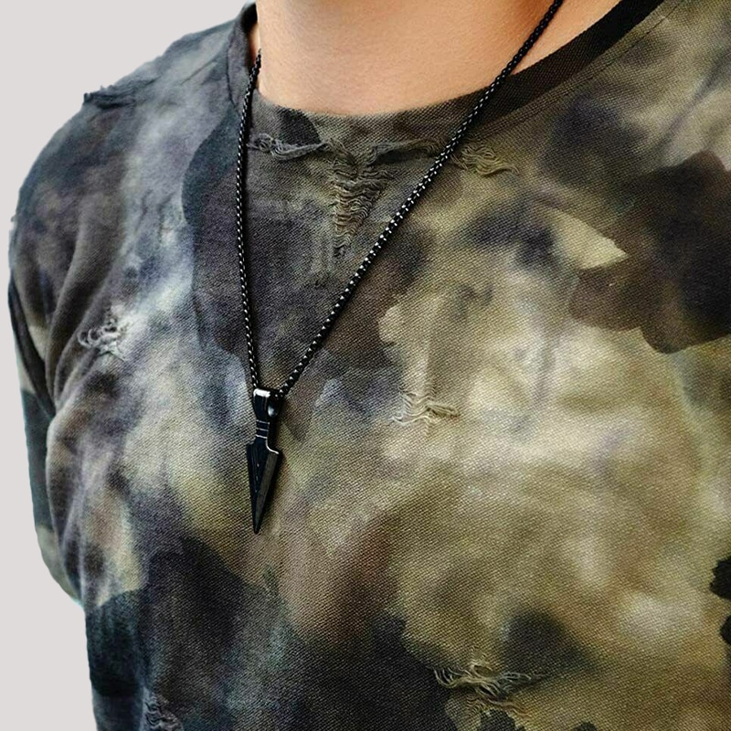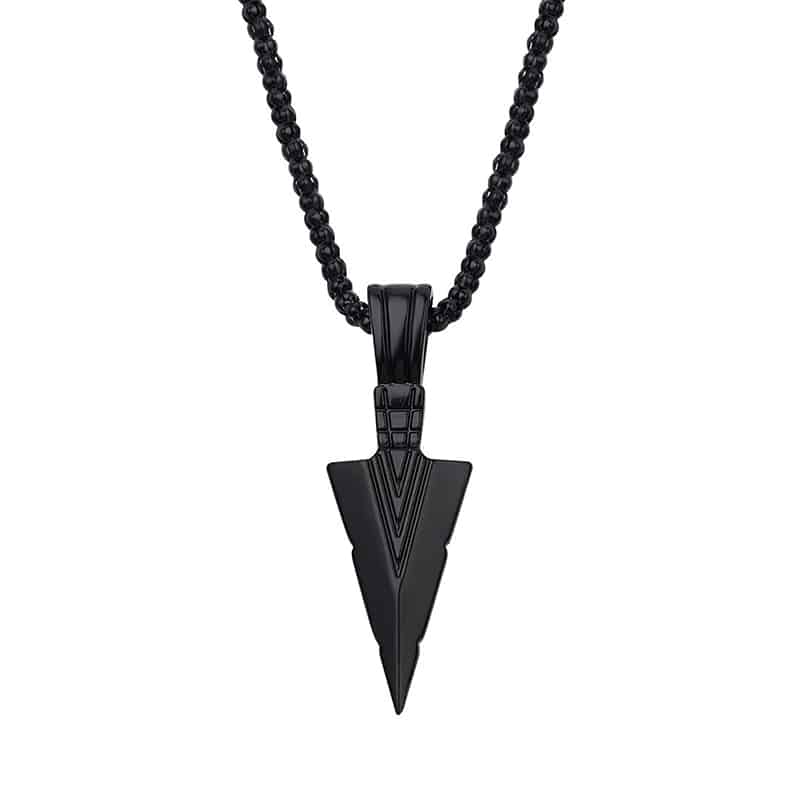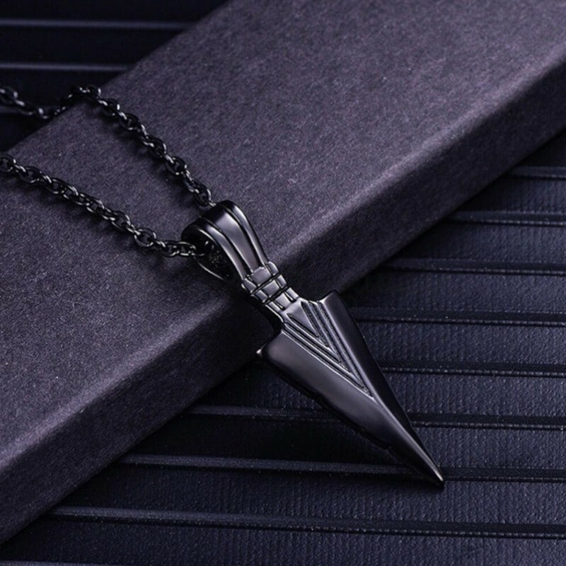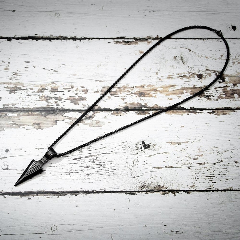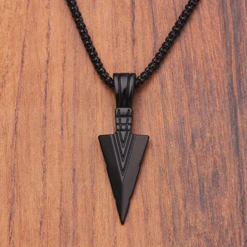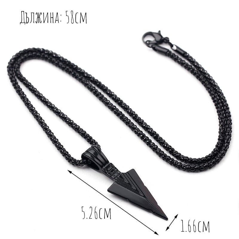 Стилно мъжко колие с изчистен медальон във форма на връх на стрела. Дизайнът символизира посока, решителност и вътрешна сила, а черното стоманено покритие придава модерен и уверен характер.